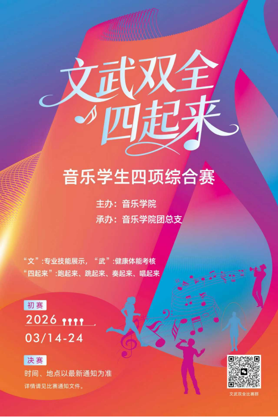 一、活动主题 “文武双全·四起来” 二、活动时间 初赛: 报名日期: 3月14日(周六)——3月15日(周日) 体能打卡期: 2026年3月16日8时(周一)——2026年3月22日22时(周日) 专业比赛视频提交截止日期: 体能打卡合格后——2026年3月24日17时。 总决赛: 时间以最新通知为准。 三、活动地点 “武”:河南艺术职业学院校内 “文”:音乐学院2C412。 四、参赛组别 声乐组(美声、民族、流行均可) 器乐组(西洋乐器、民族乐器均可)